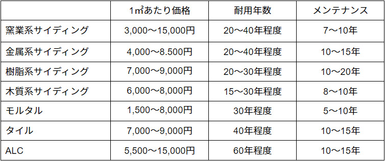 主に使われている外壁材の価格、耐用年数、メンテナンス頻度を比較してみましょう。