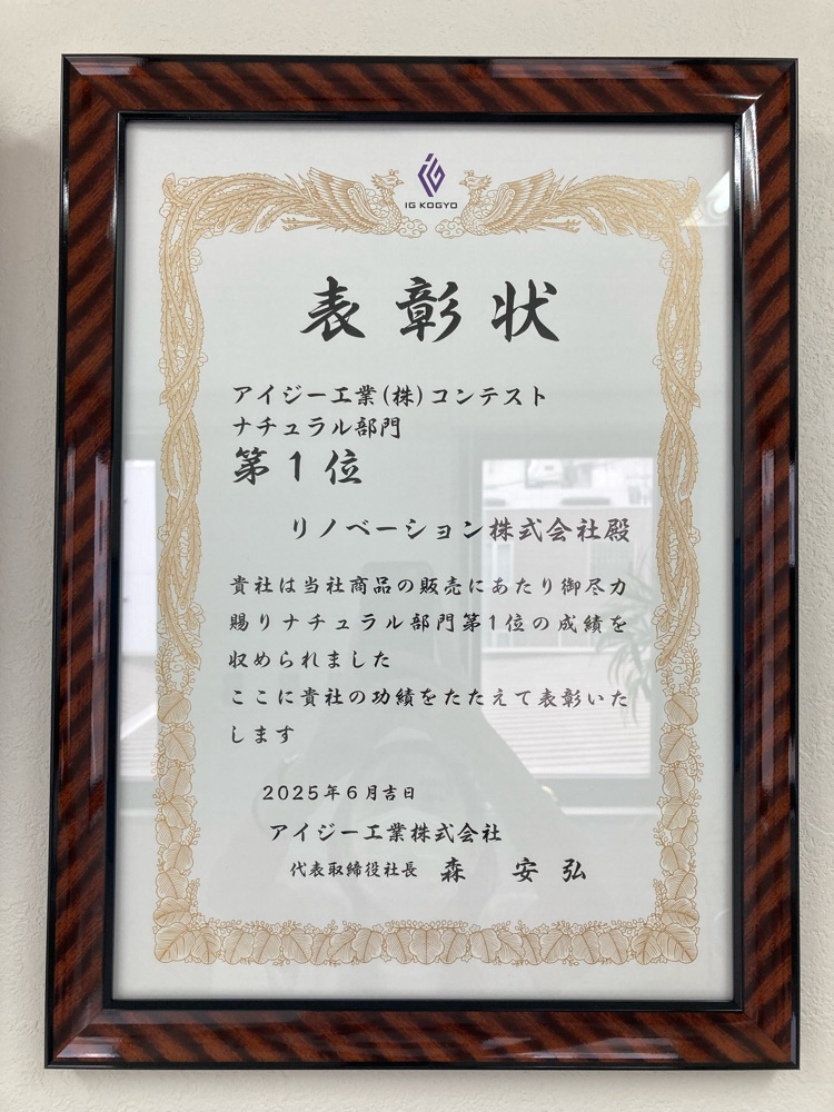 こちらは、2024年度のアイジー工業リフォーム向けサイディングの施工棟数が北海道1位の実績の賞です。