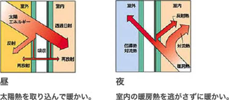 高熱(Loe-E)複層ガラスは、さらに快適性の高い、寒冷地に最適の複層ガラスです。直朱金属コーディングした低放射ガラスは、波長の短い太陽線を透過させ、波長の長い暖房熱は室内への取得を図りながら、室内の熱を外に逃がしません。